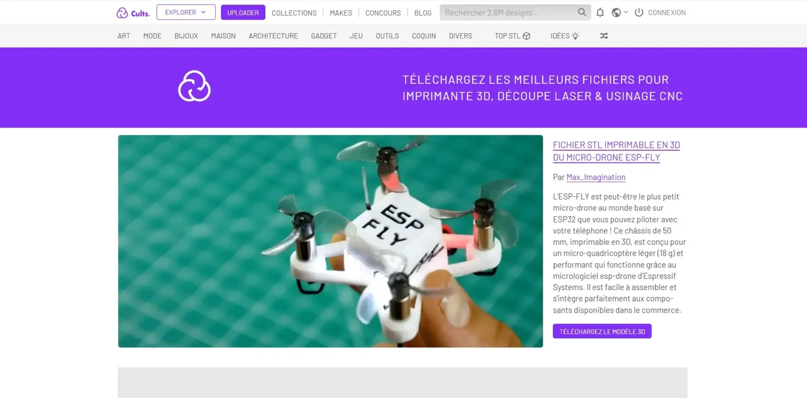 Cults3D est une plateforme française qui combine modèles gratuits et payants. Elle se distingue par la qualité et l’originalité des créations proposées, souvent conçues par des designers professionnels.