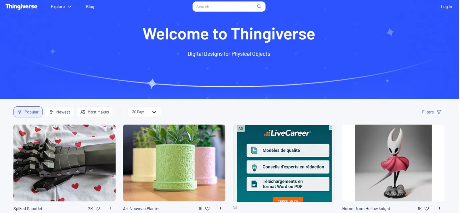 Thingiverse est probablement le site le plus connu pour trouver des fichiers 3D gratuits. Depuis de nombreuses années, il rassemble une immense communauté de passionnés qui partagent leurs créations dans tous les domaines : gadgets utiles pour la maison, figurines, accessoires de bureau, pièces mécaniques ou encore objets décoratifs.